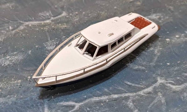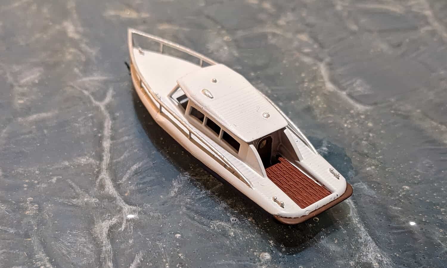 Modell einer Motoryacht für Spur N 1:160 aus dem 3D Druck.