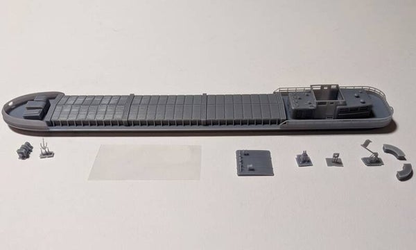 Binnenschiff mit geschlossenem Laderaum und Zubehör für Spur N 1:160. Das Vorbild für dieses Binnenschiff hat eine Länge von 45m und eine Breite von 6,55m.
