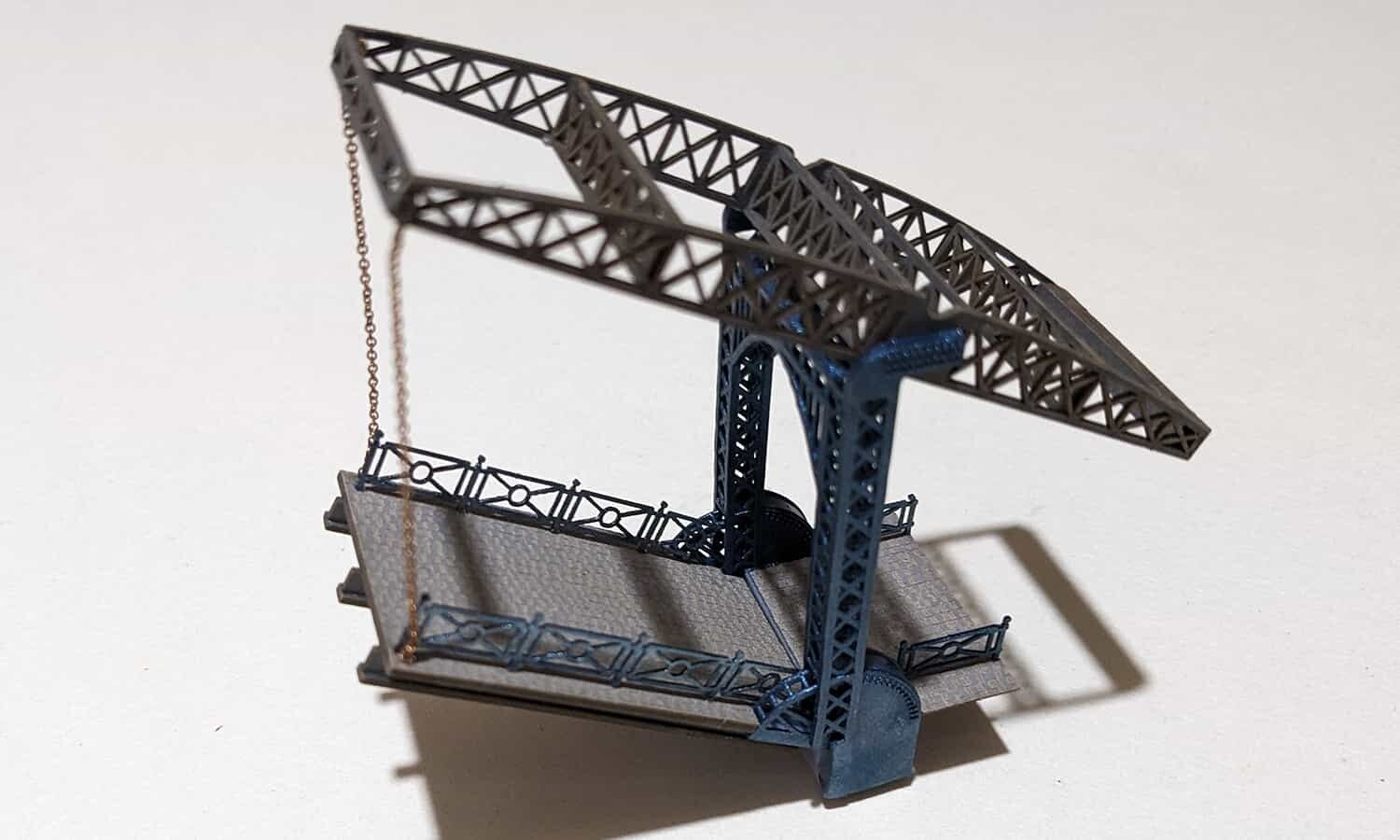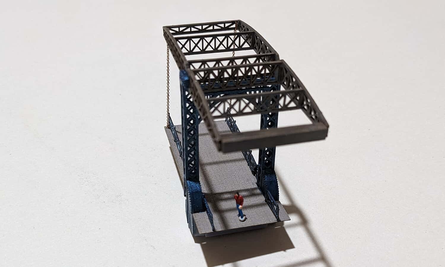 Diese Zugbrücke in Spur N 1: 160 ist nach niederländischem Vorbild gestaltet und ist ein Mix aus 3D Druckteilen und Lasercut Teilen aus durchgefärbten Karton.