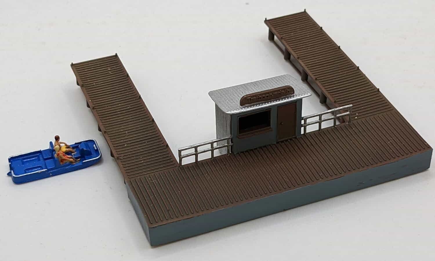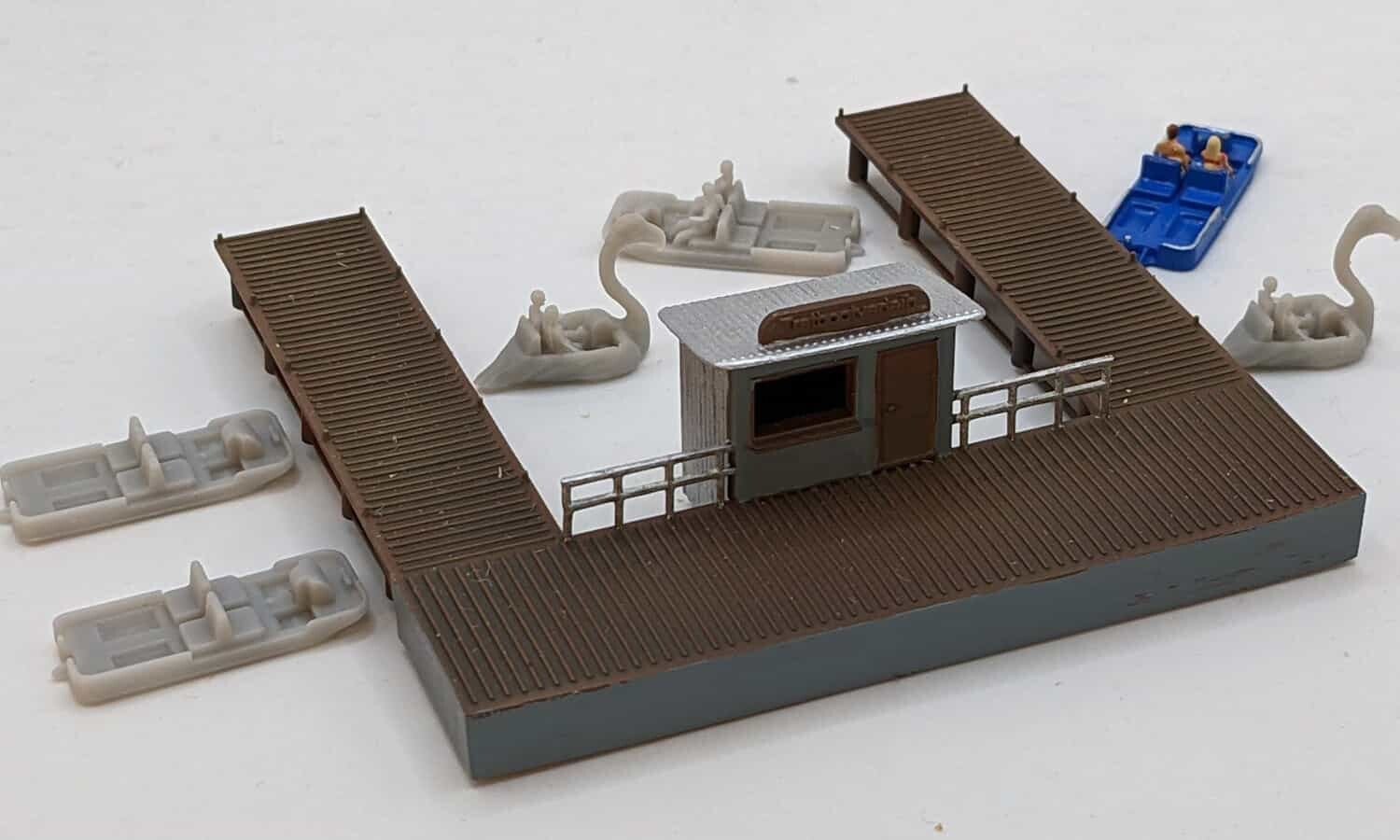Dieser Tretbootverleih für Spur H0 1:87 besteht aus mehreren Teilen ist detailliert gestaltet und diverse Tretboote sind mit Figuren ausgestattet.