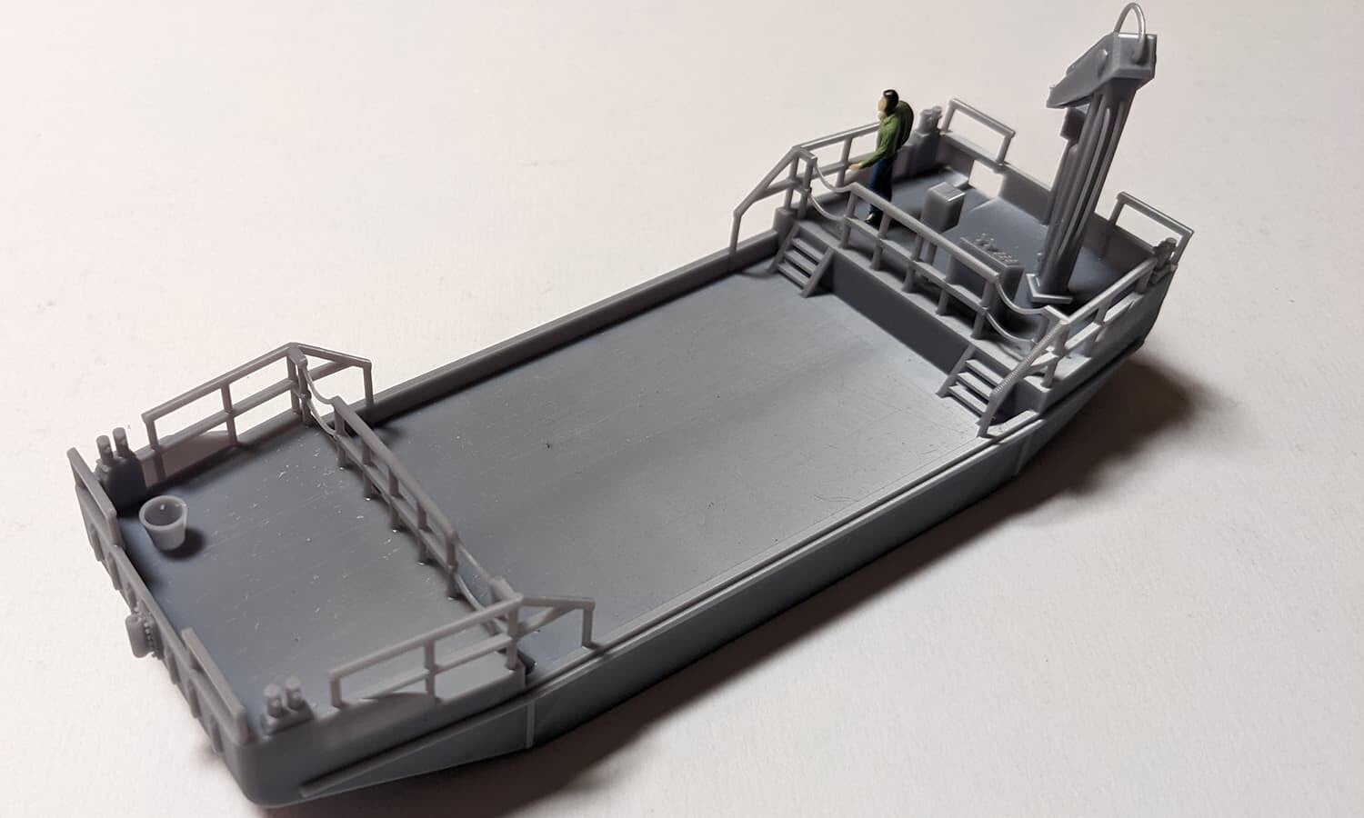 Kleiner Arbeitsprahm mit fest installierten Kran für Spur H0 1:87.