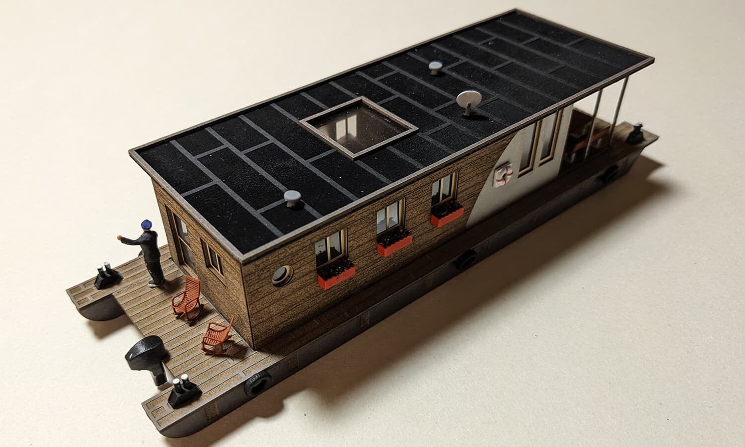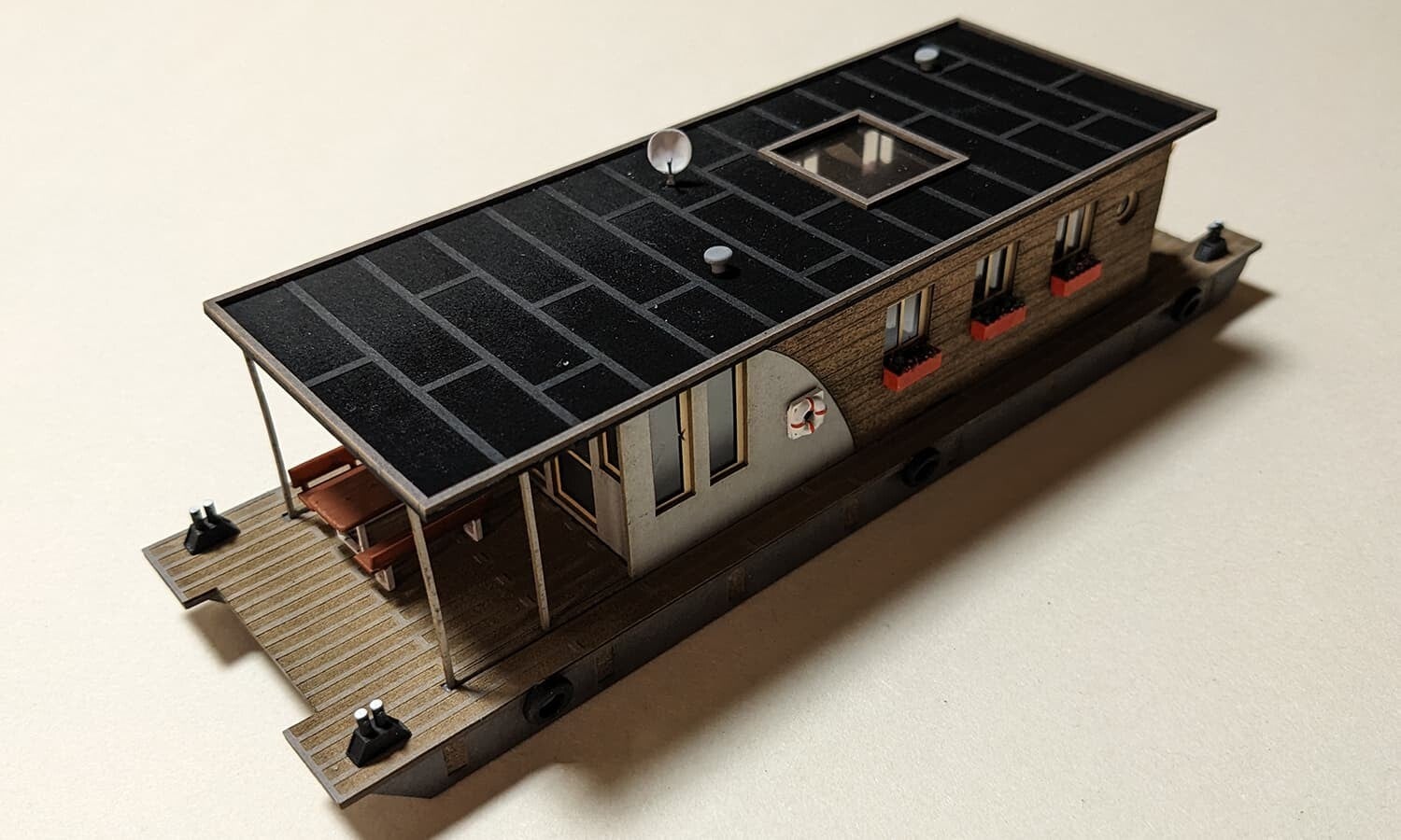 Hausboot Bausatzmix aus Laserkarton und 3D Druckteilen für Spur H0 1:87.