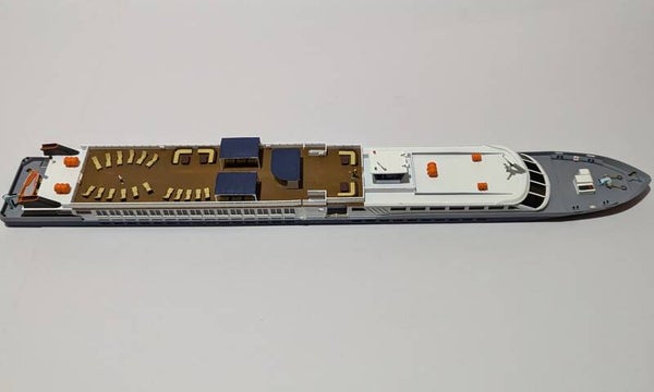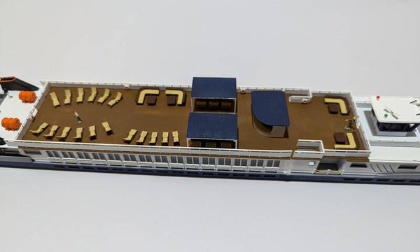 Das Modell überzeugt durch viele Details wie Liegestühle, Chillout Lounges, Sonnendächer, Bar, Rettungsboot und vieles mehr.