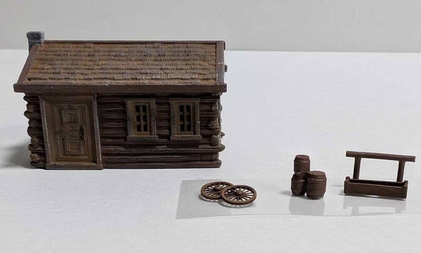 Das 3D gedruckte Set, sehr fein detailliert gestaltet, besteht aus 2 Blockhäusern mit Zubehör.