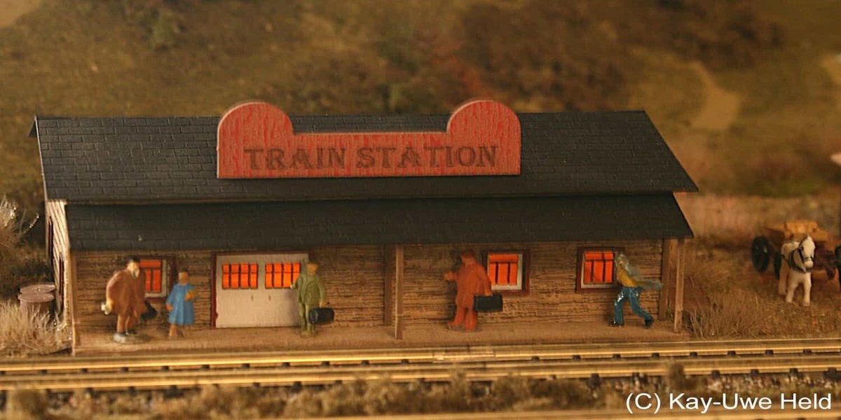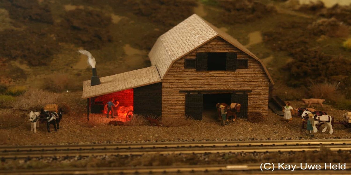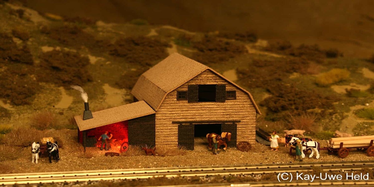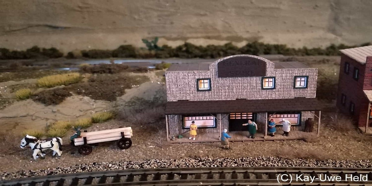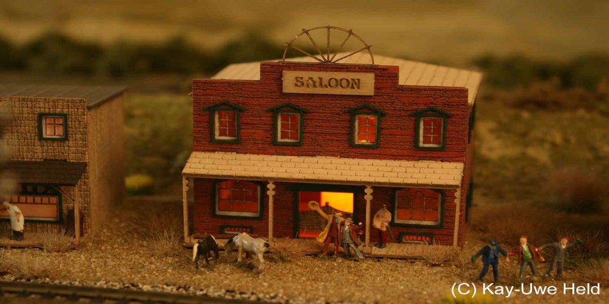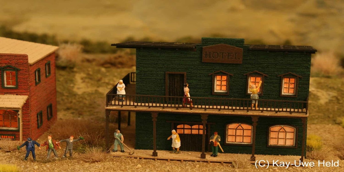 Hierbei wurden unsere Wild West Lasercut Bausätze Barber Shop (SP264), Scheune (SP257), Sheriff (SP244), General Store (SP232), Pony Express (SP243, Train Station (SP237), Hotel (SP236) und 3D Bausatz Postkutsche (SP247) verwendet. Die Bausätze wurden mit Licht ausgestattet und in der Schmiede sogar mit Flackerlicht.